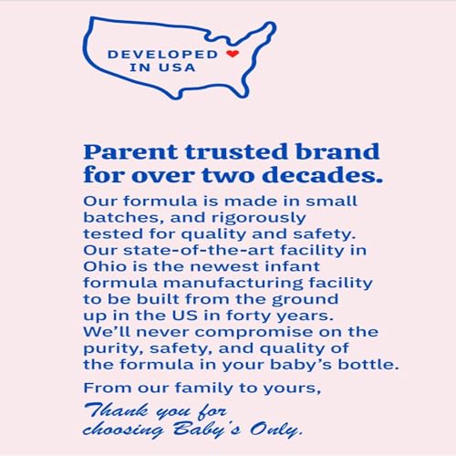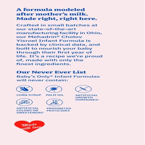 TRUSTED BRAND: With over 20 years of experience, Baby’s Only is now available in a kosher version, a special production certified by Badatz & OU. It is also Certified Cholov Yisroel and is Kosher for Passover, Kitnios.