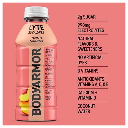 Stay hydrated with BODYARMOR Lyte Sports Drink Peach Mango. This low-calorie sports drink has no artificial sweeteners, flavors, or dyes, making it a delicious choice for all-day hydration. BODYARMOR Lyte combines coconut water with potassium-packed electrolytes, delivering essential hydration to support your active lifestyle. Enriched with antioxidants and vitamins, it’s perfect for pre-workout preparation or post-exercise replenishment. With no colors from artificial sources and no added sugar, you can feel good about every sip. Trust BODYARMOR Lyte to keep you refreshed and revitalized.