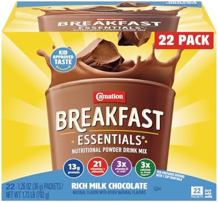 Carnation Breakfast Essentials Powder Drink Mix, Rich Milk Chocolate, 22 Count Box of 1.26 Ounce Packets.