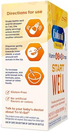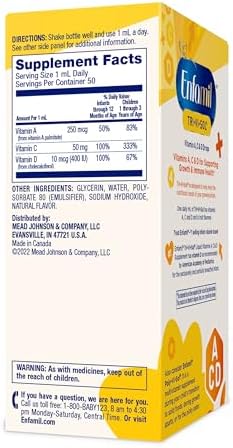 Enfamil Tri-Vi-Sol drops support babies 0-12 months who are breast fed or combo fed to complement the nutrient profile breast milk has. Tri-Vi-Sol multivitamin vitamin supplement has vitamin D to help your baby’s body absorb calcium for strong bone and teeth development, vitamin A to help support vision, healthy skin, bone and tooth growth, and immune system health, & vitamin C which is an antioxidant that supports protein metabolism, supports immune health, and promotes iron absorption. Tri-Vi-Sol is fruit flavored using natural ingredients and does not have ingredients derived from the most common food allergies. One serving has 100% of the daily value of vitamin D for breastfed infants from 0-12 months as recommended by the American Academy of Pediatrics (AAP), 100% of the daily value of vitamin C. Enfamil vitamins are the #1 infant vitamin brand and the #1 recommended infant vitamin brand by pediatricians. The standard serving for Enfamil Tri-Vi-Sol is 1 milliliter (mL) per day. *This statement has not been evaluated by the Food and Drug Administration. This product is not intended to diagnose, treat, cure, or prevent disease.
