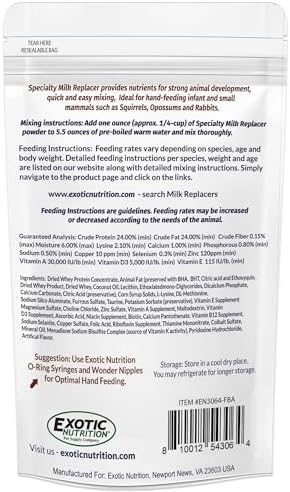 Specialty Milk Replace provides nutrients for strong animal development. Ideal for baby squirrels, rabbits, opossums, and rabbits.