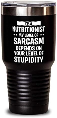 Looking for the perfect gift that combines humor and functionality? Our Funny Nutritionist Black Stainless Steel Tumbler is just what you need! With its witty quote, ‘My level of sarcasm depends on your level of stupidity,’ this tumbler is perfect for Nutritionists who appreciate a good laugh. Whether you’re searching for Birthday or Christmas gifts, this travel mug is sure to bring a smile to anyone’s face.
