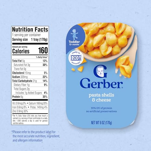 Gerber Pasta Shells and Cheese is perfect for baby led feeding. With wholesome ingredients designed for tiny hands, this toddler pasta makes mealtime for toddler easier. To prepare, puncture seal on tray and microwave for 20 seconds. Then drain liquid and test temperature before serving. Gerber’s dedication to quality has been and always will be our highest priority. We’re committed to being your partner in parenthood with quality ingredients & expert guidance.