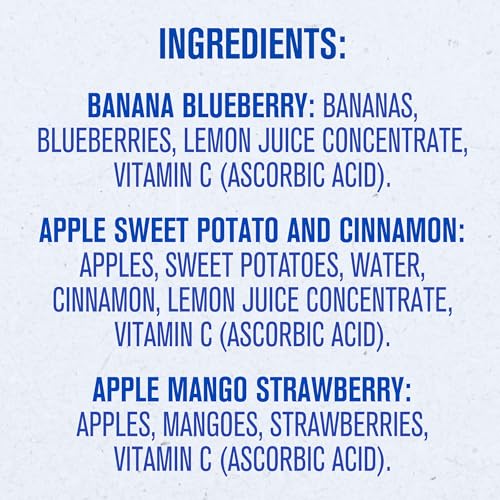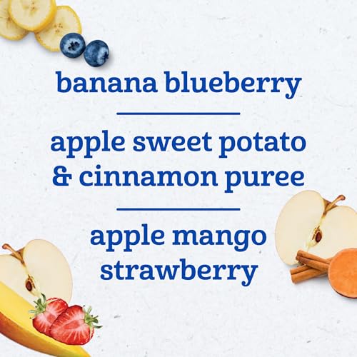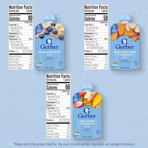 CONVENIENT BABY FOOD: Our Gerber assorted pack with Apple Sweet Potato Cinnamon, Apple Mango Strawberry, and Banana Blueberry Puree Pouches is designed for ease and convenience. These Gerber baby food pouches are portable, re-closeable* and easy-to-store, for busy parents. *Refrigerate after opening, and use within 1 day