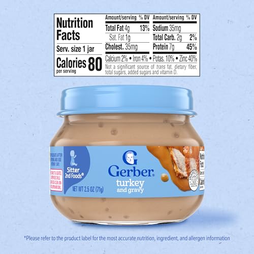 Gerber Turkey and Gravy Baby Food Jar is a premium choice for your child and is crafted with wholesome ingredients for your little one. Each turkey jar has 40% of the daily value of zinc and 10% of the daily value of potassium. This stage two baby food is designed for babies who are ready to explore new textures and flavors, making it a great addition to your baby’s diet. Gerber baby food understands the importance of providing wholesome ingredients. This puree baby food offers tender turkey, finely pureed to ensure a smooth and enjoyable eating experience for your baby.