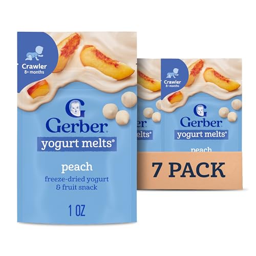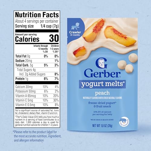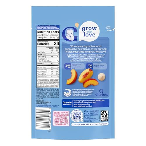 SMILES GUARANTEED BABY SNACKS: Gerber Peach Yogurt Melts are thoughtfully crafted for busy parents who want to provide their little one with a nutritious on-the-go baby snack. These baby melts are made with real fruit and yogurt and offer a practical solution for parents seeking both quality and convenience