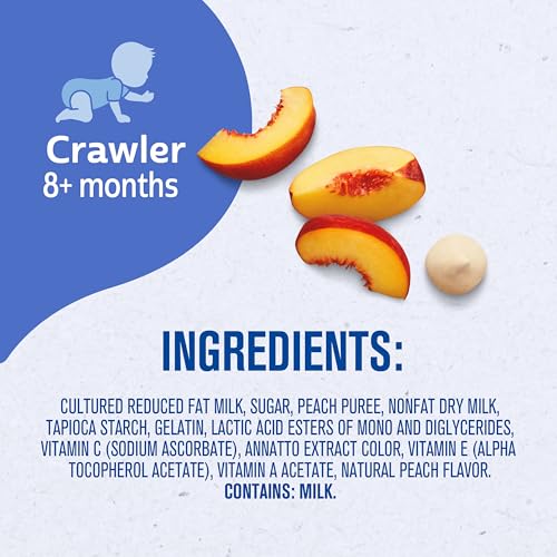 STAGE 3: These peach yogurt melts are stage 3 baby food snacks, made for children 8 months and older. Your little one may be ready for Gerber baby melts if they crawl without their tummy on the floor, start using their fingers to eat, or start using their jaw to mash food