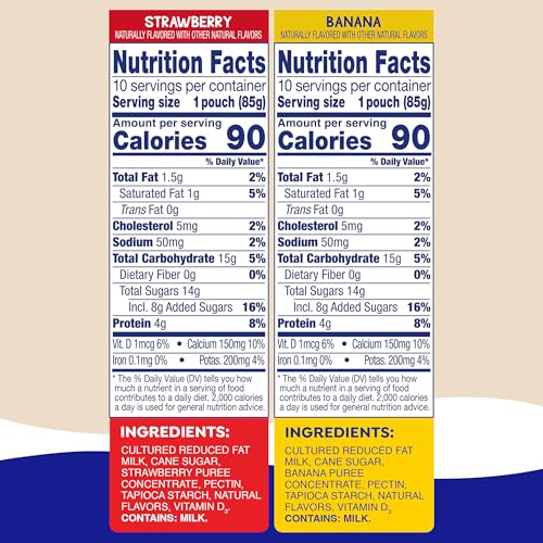 Made from real yogurt and fruit, these kids yogurt pouches contain 4g of protein per pouch/serving, no preservatives and are a good source of calcium and Vitamin D** (**At Least 10% Of The Daily Value Per 6 Oz.)