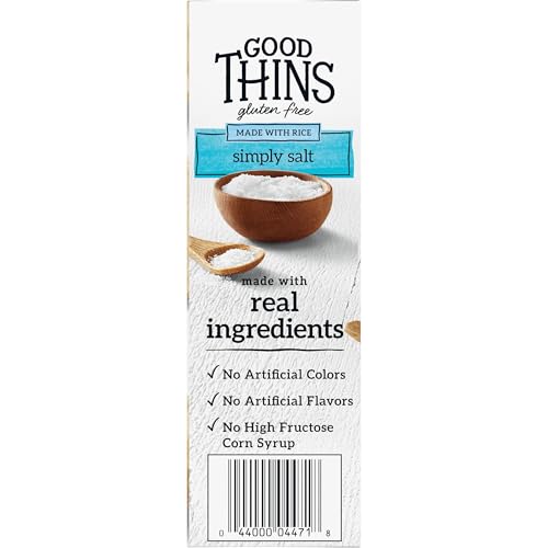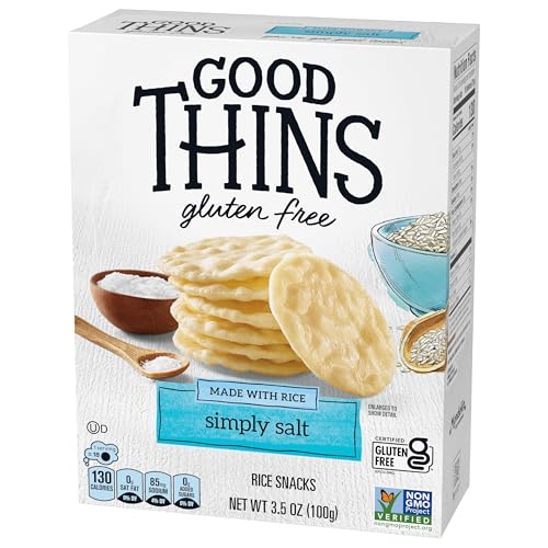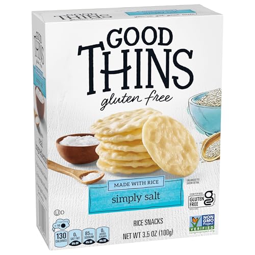 Enjoy a wholesome gluten free snack anytime, anywhere with GOOD THINS Simply Salt Rice Crackers. These gluten free rice snacks are simply salted for a versatile flavor. Baked for an irresistible crunchy texture, these round certified Gluten-Free by GFCO crackers contain no artificial colors, artificial flavors, cholesterol or high fructose corn syrup and are Non-GMO Project Verified for a snack that fits your preferences making them delicious gluten free snacks for adults. Break out these thin crackers for everyday snacking, or pair them with salads and sandwiches. The 3.5 ounce box offers up plenty of deliciously crunchy rice thins to share and make excellent travel snacks and lunch snacks for adults and kids.