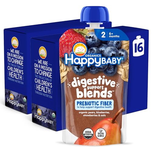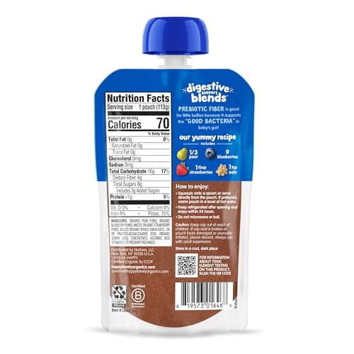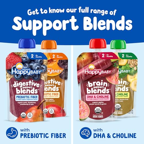 Did you know the bacteria in baby’s gut is important for their health? Happy Baby Digestive Support Blends deliver prebiotics, which help support baby’s digestive health by aiding good bacteria in baby’s belly. This bright blend features a yummy recipe of organic pear, blueberries, strawberries and oats. All Happy Baby products are always certified USDA organic, made with ingredients that are non-GMO and grown without the use of toxic persistent pesticides.