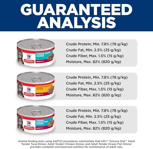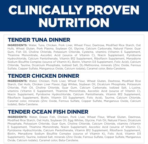 This variety pack contains 4 cans each of Tender Chicken, Tender Tuna, and Tender Ocean Fish Cat Foods. Your cat will love these delicious, tender baked dinners covered in gravy. This product provides the purrfect balance between variety cats crave and the precise nutrition they need to maintain vital organ health. Great tasting nutrition for a long, happy life. With soft purrs and even softer nuzzles, you and your cat have a thing all your own. Because every moment you spend together is special, we strive to give you more of them. With wholesome ingredients and the right nutrients, Hill’s Science Diet is precisely prepared to offer your cat the nutrition she needs for lifelong health and happiness.