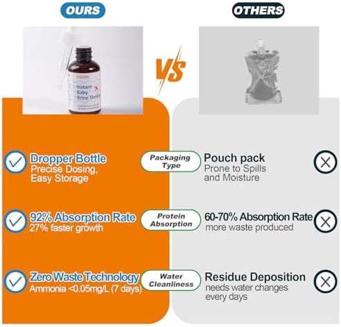 No Hatching Required : Our instant baby brine shrimp fish food is ready to use straight out of the bottle, eliminating the need for time-consuming hatching processes. Simply use the dropper for easy feeding!