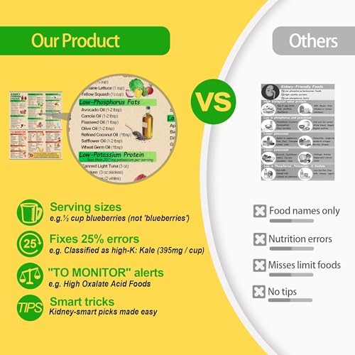 CKD & Dialysis-Approved Nutrition Reference: Developed with renal specialists, this comprehensive kidney diet food chart & guidelines poster covers 3/4 stages, helping you build safe meal plans and kidney-approved grocery lists. Includes hyperkalemia prevention tips