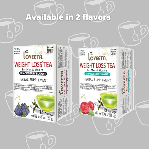 Introducing Loveeta Weight Loss Tea in a delightful Blackberry Cranberry blend. This all-natural tea is designed to assist in your weight loss journey by reducing your appetite, curbing cravings, and limiting nutrient absorption. With its metabolism-boosting properties, our tea aids in burning calories more efficiently, promoting a healthier lifestyle. Free from artificial colors and preservatives, Loveeta Weight Loss Tea is an excellent choice for those seeking a natural, effective weight management solution. Each box contains 15 convenient tea bags, allowing you to enjoy our refreshing tea anywhere, anytime. Trust Loveeta for a flavorful, uncomplicated approach to weight loss.
