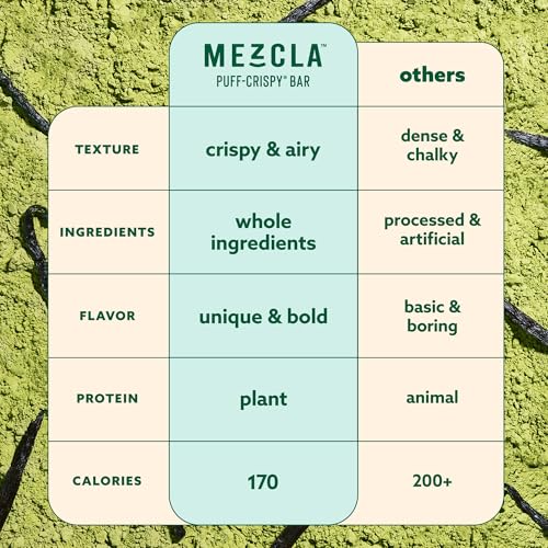 PERFECT PUFF-CRISPY TEXTURE: Each Mezcla Protein Bar is crafted with our signature puff-crispy base made from crunchy pea crisps and quinoa. Every bite delivers a light, airy crunch that perfectly complements the smooth, creamy bottom coating and the bold flavor throughout the bar.