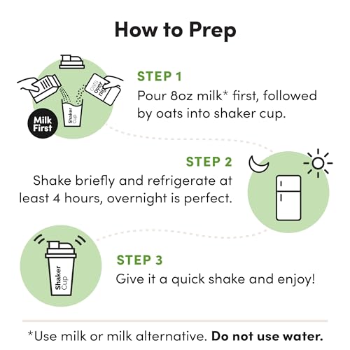ZERO MORNING PREP – Mix one pack of Oats Overnight with your choice of milk substitute (or traditional milk) the night before and place in the fridge so you can grab and go in the morning. Ditch the spoon and enjoy this premium oatmeal directly from the Shaker Bottle (included), perfect for your morning commute.