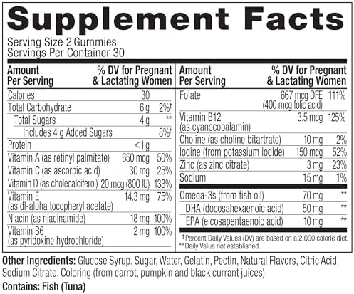 Say hello to your body’s (and your baby’s new BFF): OLLY’s The Essential Prenatal Folic Acid + DHA. Whether it’s before, during or after your pregnancy, this nurturing blend provides essential nutrients plus Omega-3 DHA (the good fat that mom and baby need daily) to help keep you healthy and energized. OLLY prenatal gummies also deliver the good stuff to your precious cargo.* Folic Acid is a B vitamin that supports growth and development of your little one. DHA is an essential fatty acid that supports healthy brain and eye development for baby (extracted from a purified marine source), and immune supportive nutrients like vitamins C and E help support overall health and wellness during pregnancy.* Good health is at the center of everything we do. That’s why we’ve made it our mission to make nutrition easy to understand. We do it by crafting products that are as effective as they are delicious—because we know when something feels good, you’re more likely to do it.* Contains: Fish (tuna). *These statements have not been evaluated by the Food and Drug Administration. This product is not intended to diagnose, treat, cure or prevent any disease.