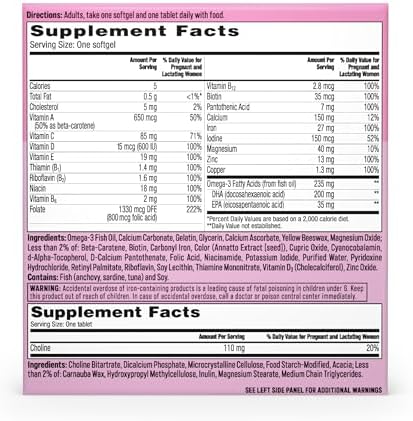 Simple daily routine: Easy to take prenatal vitamins for women with iron. Adults, take one softgel and one tablet daily with food
