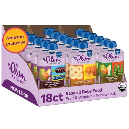 Baby Food for your Little Foodie. Plum Organics Stage 2 (6+ months) organic baby food pouches are made with blends of fruits, veggies, and ingredients that are perfect for exposing your little foodie to unique flavors, textures, and colors. Our Pear, Purple Carrot, and Blueberry blend, Banana and Pumpkin blend, and Pear, Spinach, and Pea blend are each made with non-GMO, organic ingredients for organic baby food that your baby will love. Plum Organics pouches are naturally preserved, unsalted, unsweetened, and kosher parve. And since our baby food pouches are convenient, portable, and resealable, you can customize portion sizes, whether you’re at home or you need a simple snack on the go.