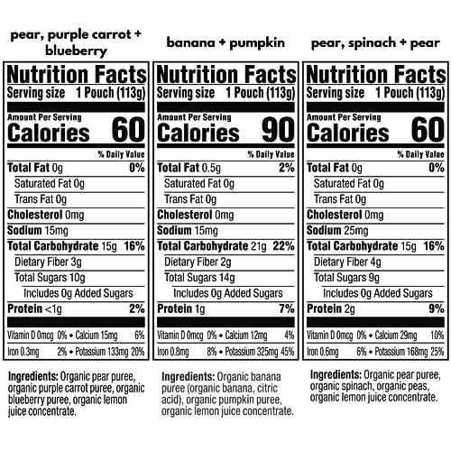 MADE WITH NATURAL FLAVORS: Pear, Purple Carrot, and Blueberry, Banana and Pumpkin, and Pear, Spinach, and Pea blends made with organic purees