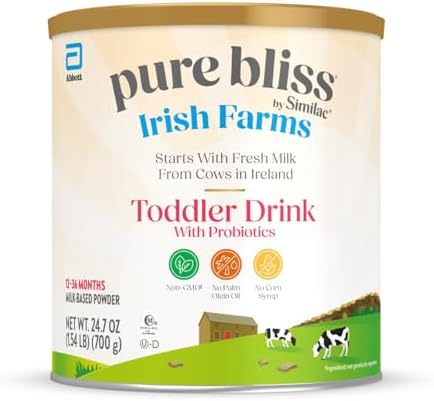 Pure Bliss by Similac products are crafted with care for you and your little one. As the makers of Pure Bliss, we’re inspired by the idea that providing nutrition for your toddler should be simple. We’re here to support you on your journey with your little one—to nurture their growing body and cradle them with love. Pure Bliss by Similac Irish Farms Toddler Drink starts with fresh milk from cows in Ireland. It is made with high-quality ingredients and has DHA to support brain and eye development, is non-GMO,† and has no artificial growth hormones,‡ no palm olein oil, and no corn syrup. * Not for children with galactosemia. † Ingredients not genetically engineered. ‡ Milk ingredients are derived from milk of non-rbST-treated cows, which is not different from milk of rbST-treated cows.