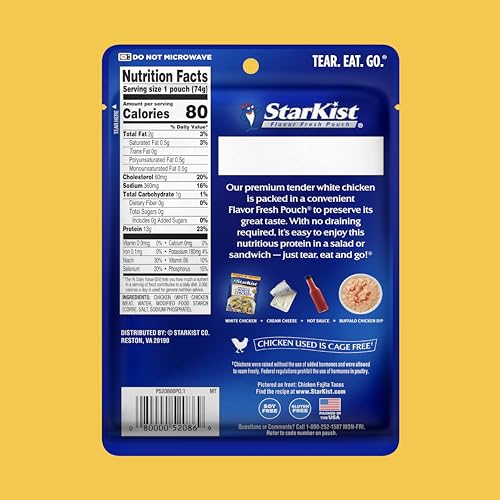 Premium Chicken: Starkist Premium White Chicken pouches feature fully cooked, tender chicken that is ready to enjoy in all of your favorite recipes. It’s perfect for quick snacks or meals on the go