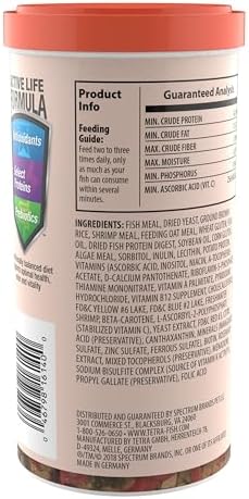 TetraFin Goldfish Flakes are a nutritionally complete daily diet for all goldfish and small koi. Ideal for use in aquariums and outdoors in small ponds too. This scientifically developed mix of highly nutritious ingredients plus vitamins, minerals and trace elements will enhance your fish’s naturally brilliant colors. Includes patented, health-enhancing ProCare formula to help support your fish’s immune system for optimal health and long life. This precise blend of immunostimulants, vitamins, biotin and omega-3 fatty acids is custom designed to strengthen a fish’s resistance to disease and stress. Feed your goldfish two to three times daily, only as much as your fish can consume within several minutes. Tetra brand’s flake food formulations have been designed to be easily digested by fish and not to leach color, helping to keep aquarium water clean and clear when used as directed. Since 1951, Tetra has developed the world’s most comprehensive body of fish food knowledge, and fishkeeping enthusiasts have looked to the brand for products and solutions that add ease and beauty to their home. Whether you’re an experienced hobbyist or just starting out, Tetra has everything you need – from a large variety of quality fish food and innovative equipment to test kits and decor.