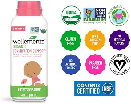 Certified Clean Ingredients: Our Organic Constipation* ease for infants USDA Certified Organic, Non-GMO Project Verified, Vegan, NSF Certified, and free from parabens, artificial colors, artificial flavors, gluten, and the top 9 most common allergens.